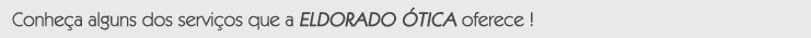 CONSERTOS: - Soldas - Dourações - Hastes - Troca de plaquetas - Parafusos - Limpeza - Ajustes - Todo tipo de manutenção - Acessórios em geral TRATAMENTOS: - Anti-Reflexivos - Filtro Ultra Violeta - Coloração - Espelhamento - Fotossensível (Escurece no Sol) - Metalização - Anti-risco Para mais informações sobre nossos serviços, clique aqui e entre em contato. |